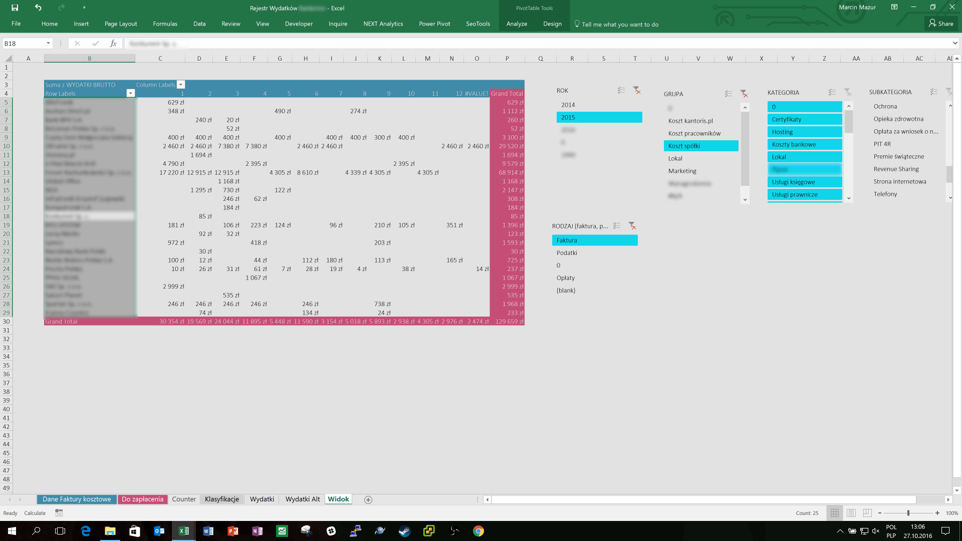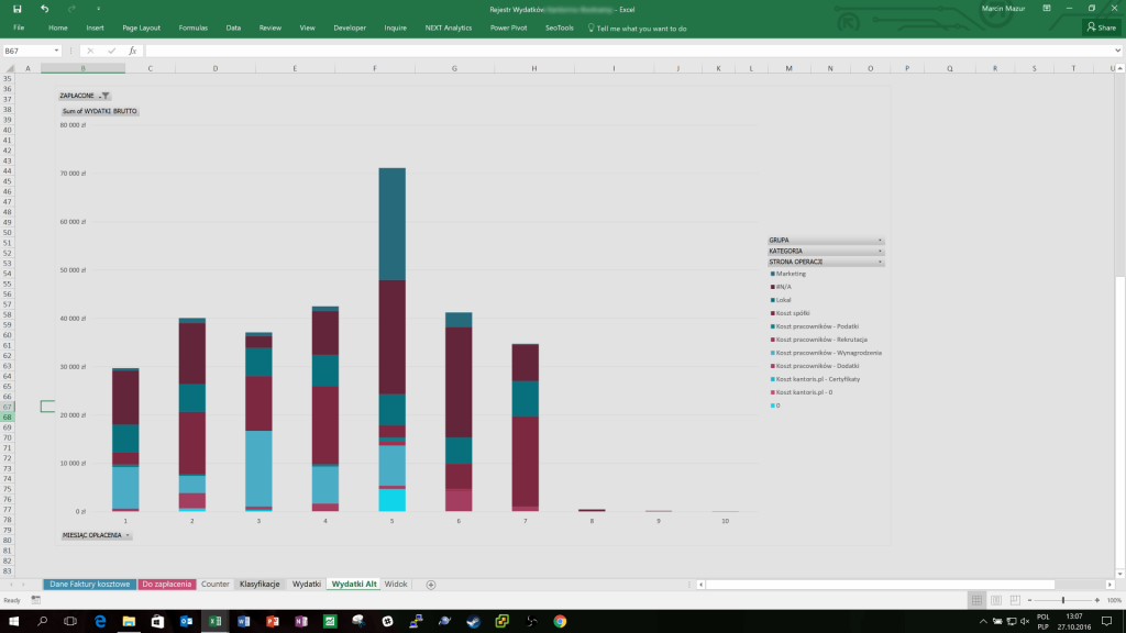Excel segmentuje koszty z programu księgowego według wybranych kryteriów. Powyżej widać koszty podzielone ze względu na: